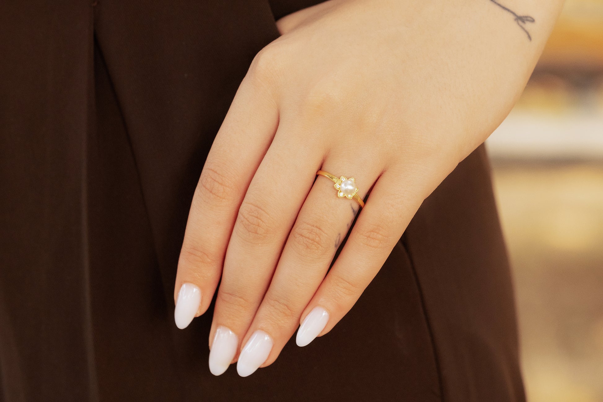 Çiçek Desenli İnci Yüzük | 925 Gümüş