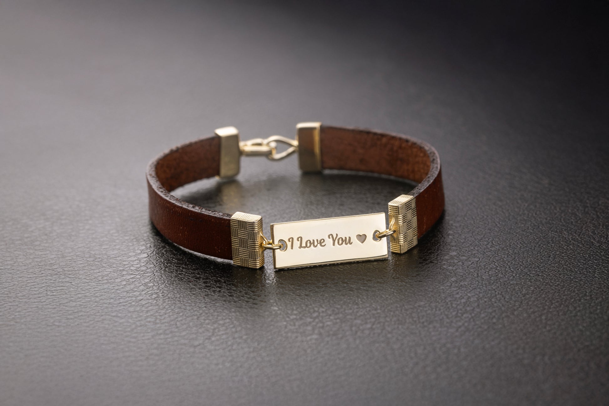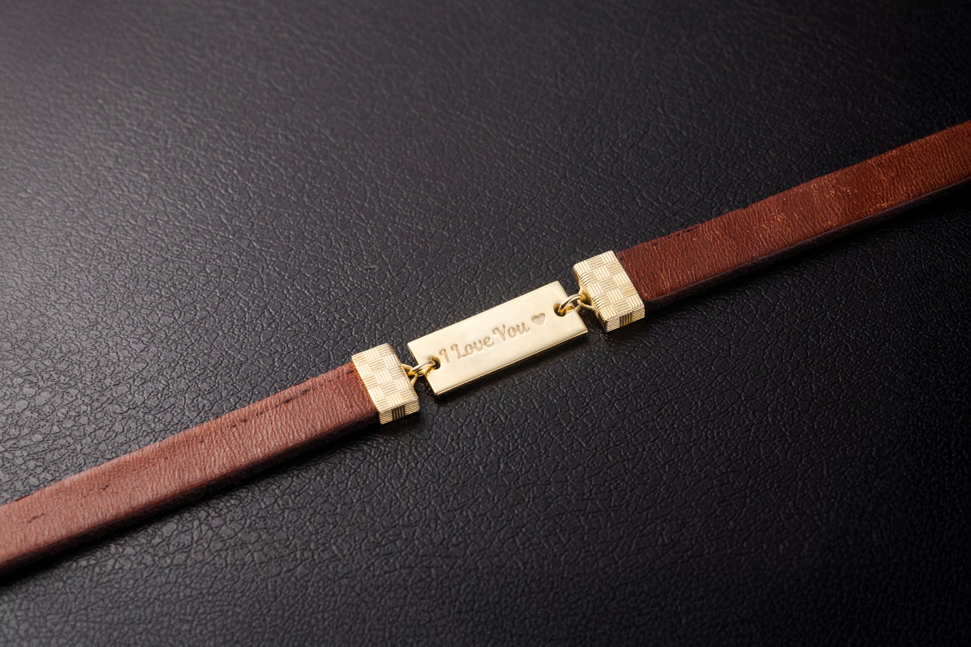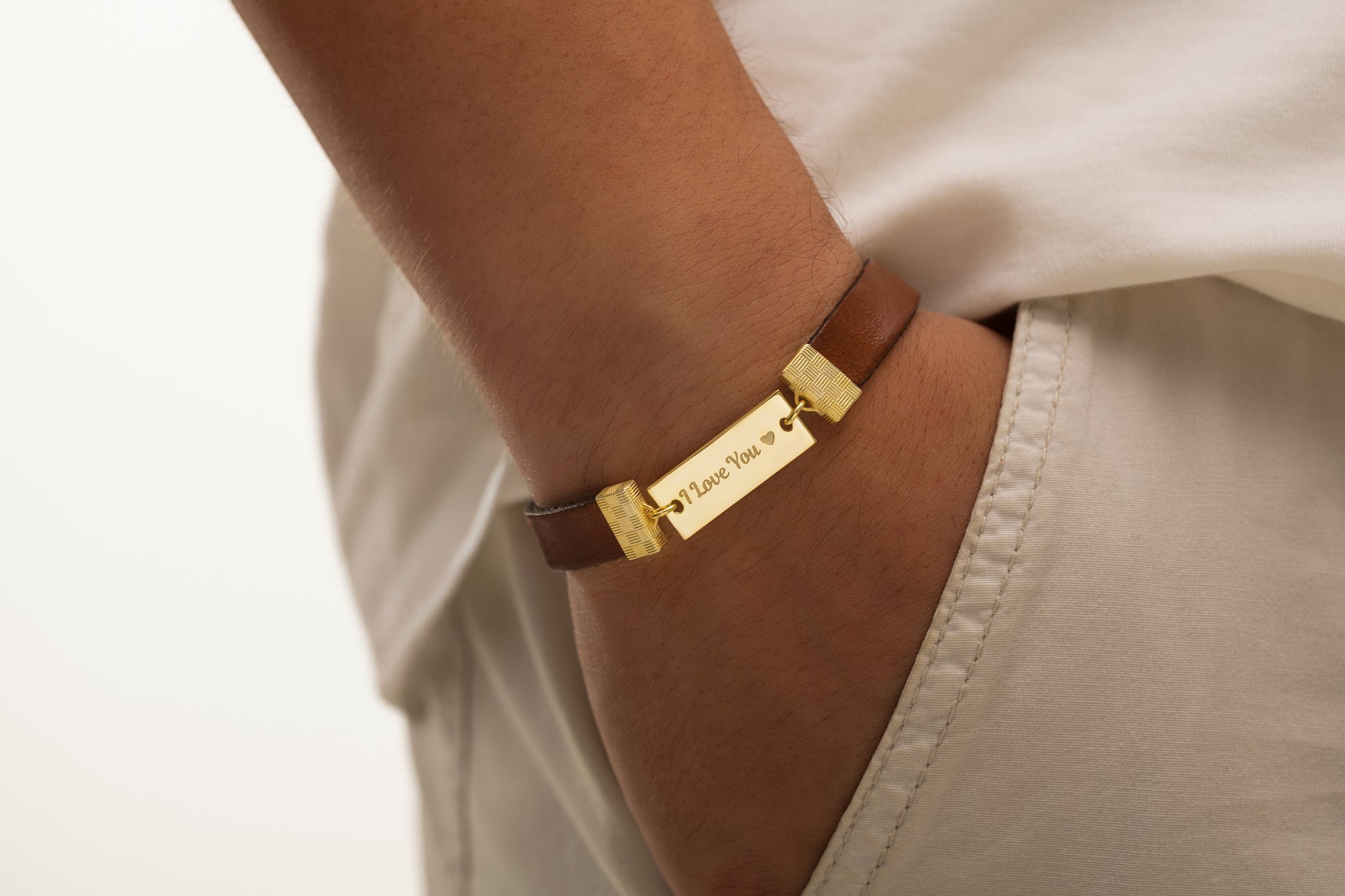 Gold Kaplama Kişiye Özel Kahverengi Deri Bileklik | 925 Gümüş