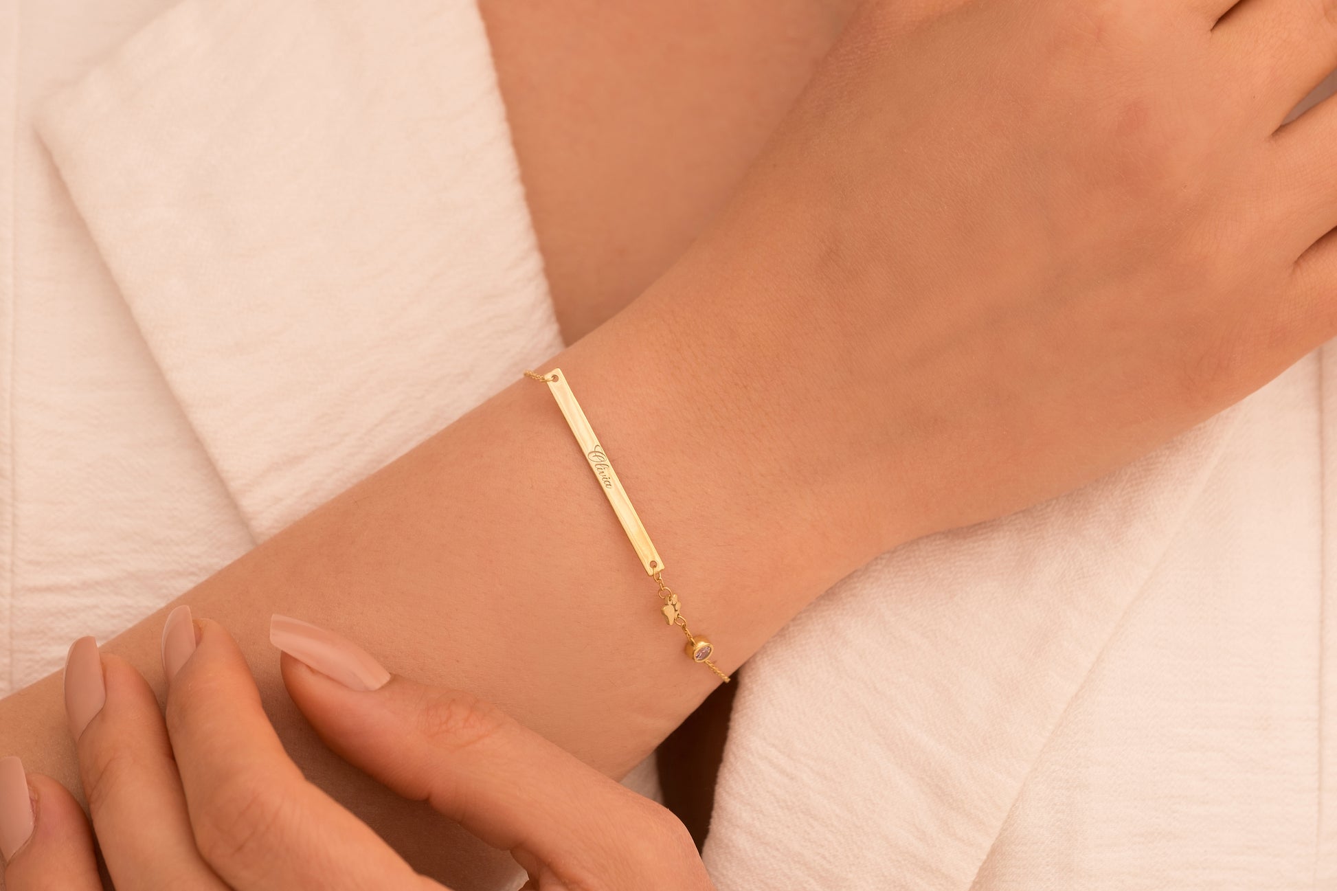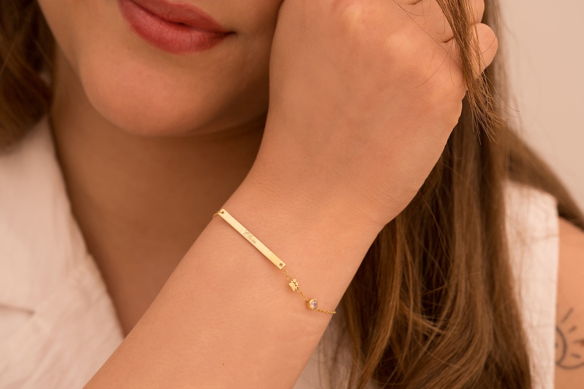 Doğum Taşlı Pati Figürlü İsim Bileklik | 14 Ayar Altın