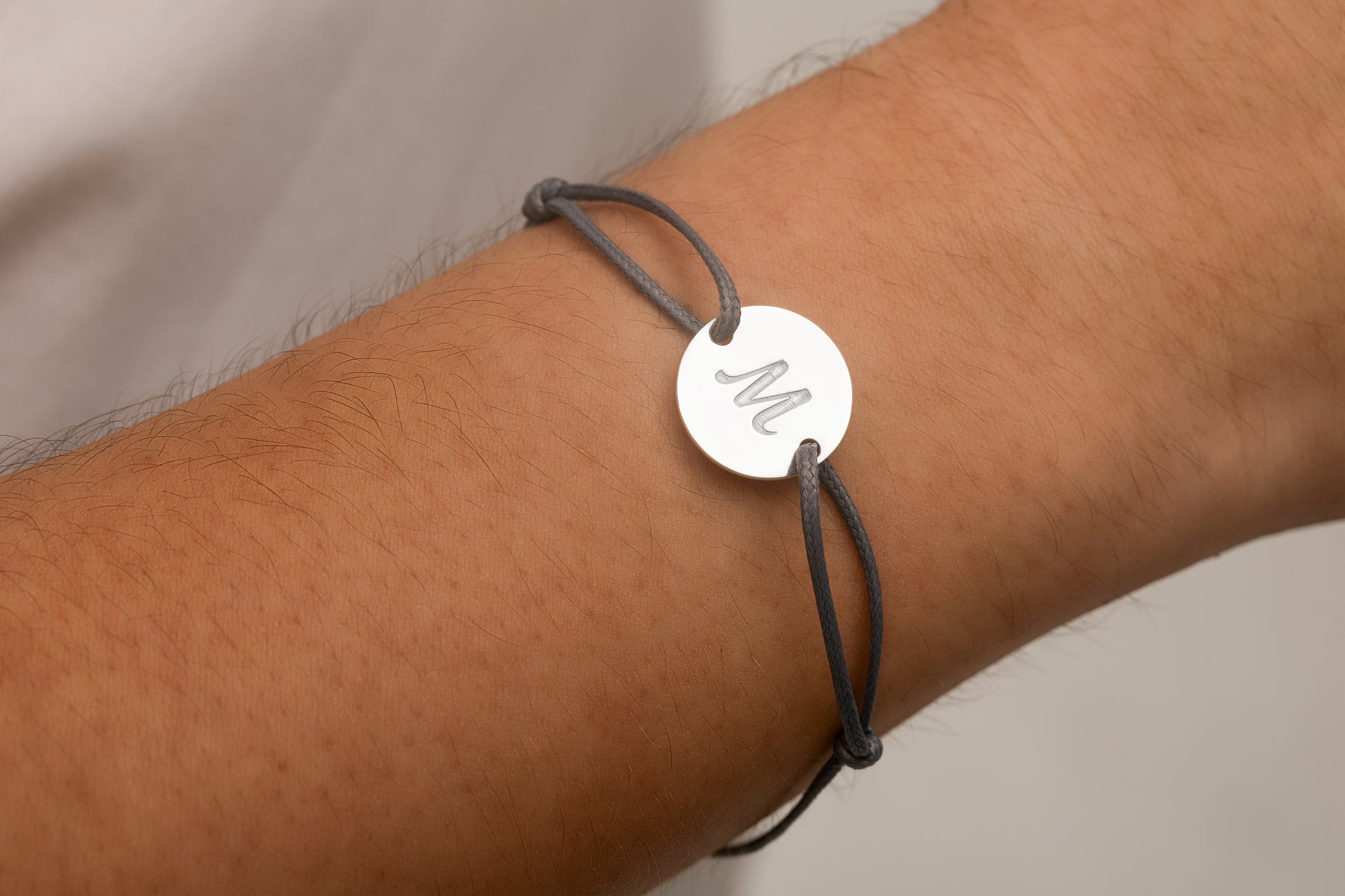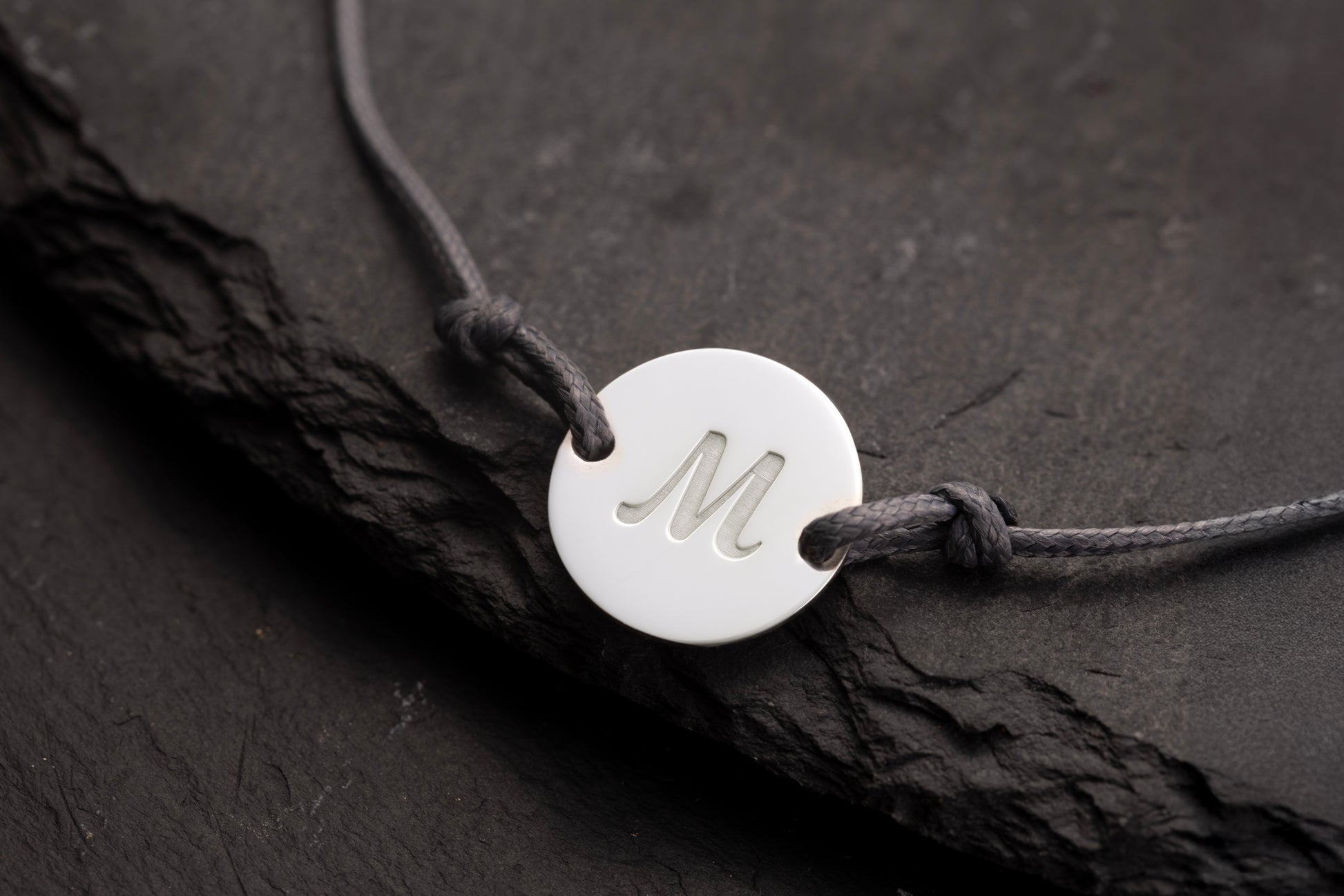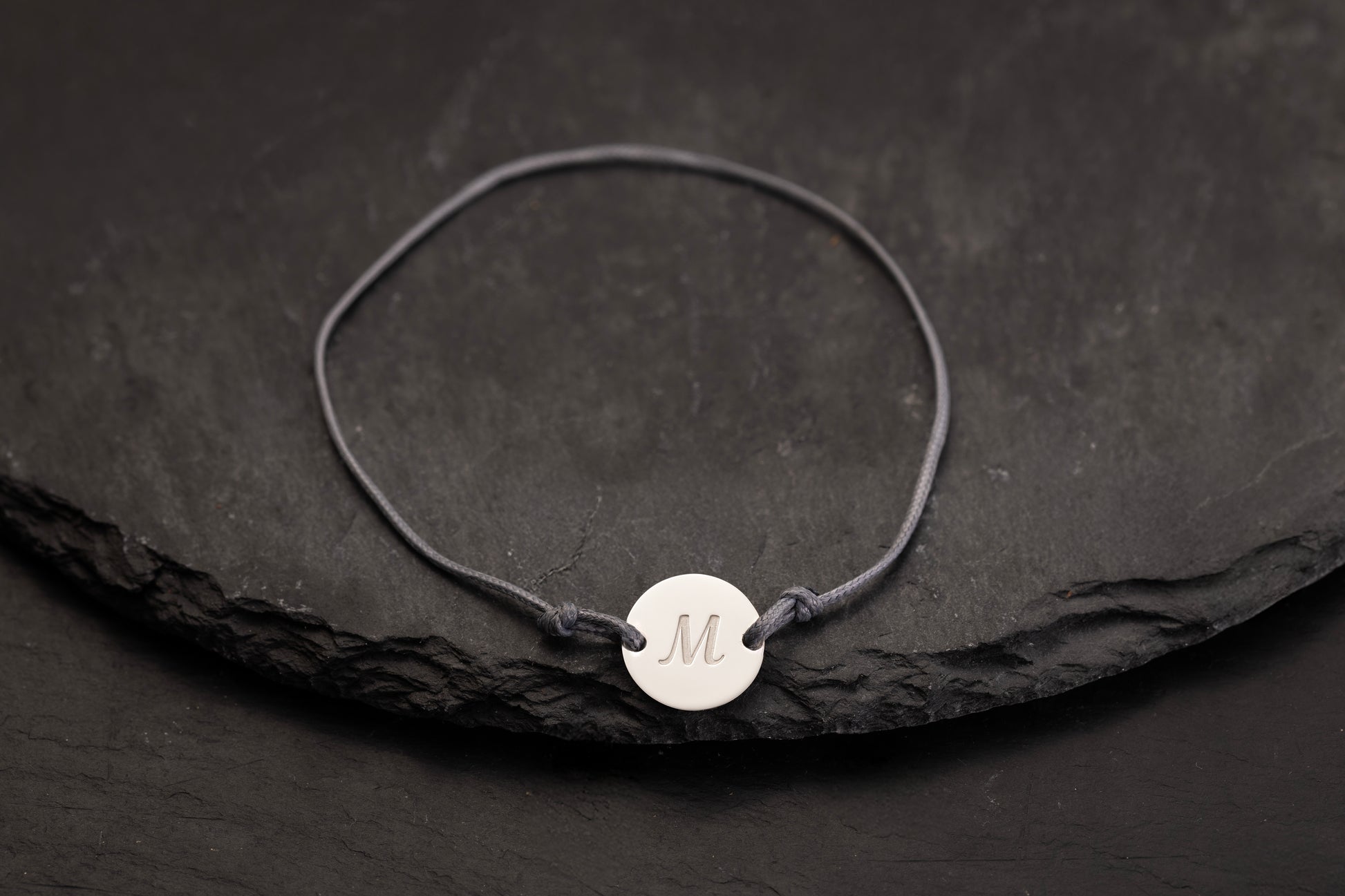 Yuvarlak Tek Harf Gri İnce Örgülü Deri Bileklik | 925 Gümüş